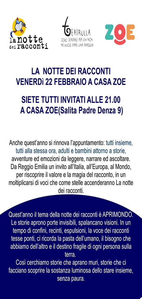 Da Reggio Emilia un invito all’Italia, all’Europa al Mondo per riscoprire il valore e la magia del racconto in un moltiplicarsi di voci come stelle nella notte.